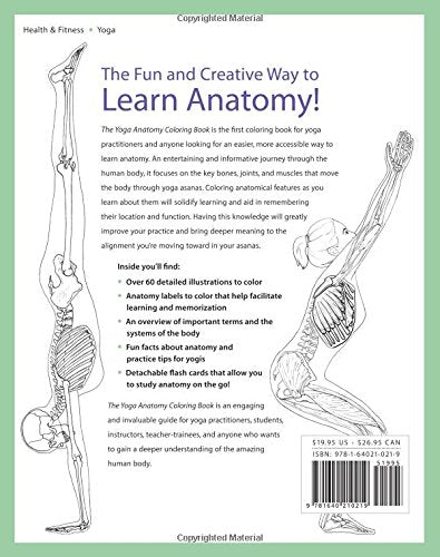 Yoga instructor, licensed massage therapist, and anatomy teacher Kelly Solloway provides an entertaining and informative journey through the human body, focusing on the bones, joints, and muscles used in yoga. After an overview of helpful terms, Kelly covers the skeletal system, joints, and connective tissue, followed by the muscular system. Each anatomical feature is illustrated with a beautiful black-and-white drawing of a yoga posture, or asana, to color. Coloring the bones and muscles, and their names, will help you to remember their location and function, and 32 perforated flash cards enable readers to quiz themselves and study yoga anatomy on the go.